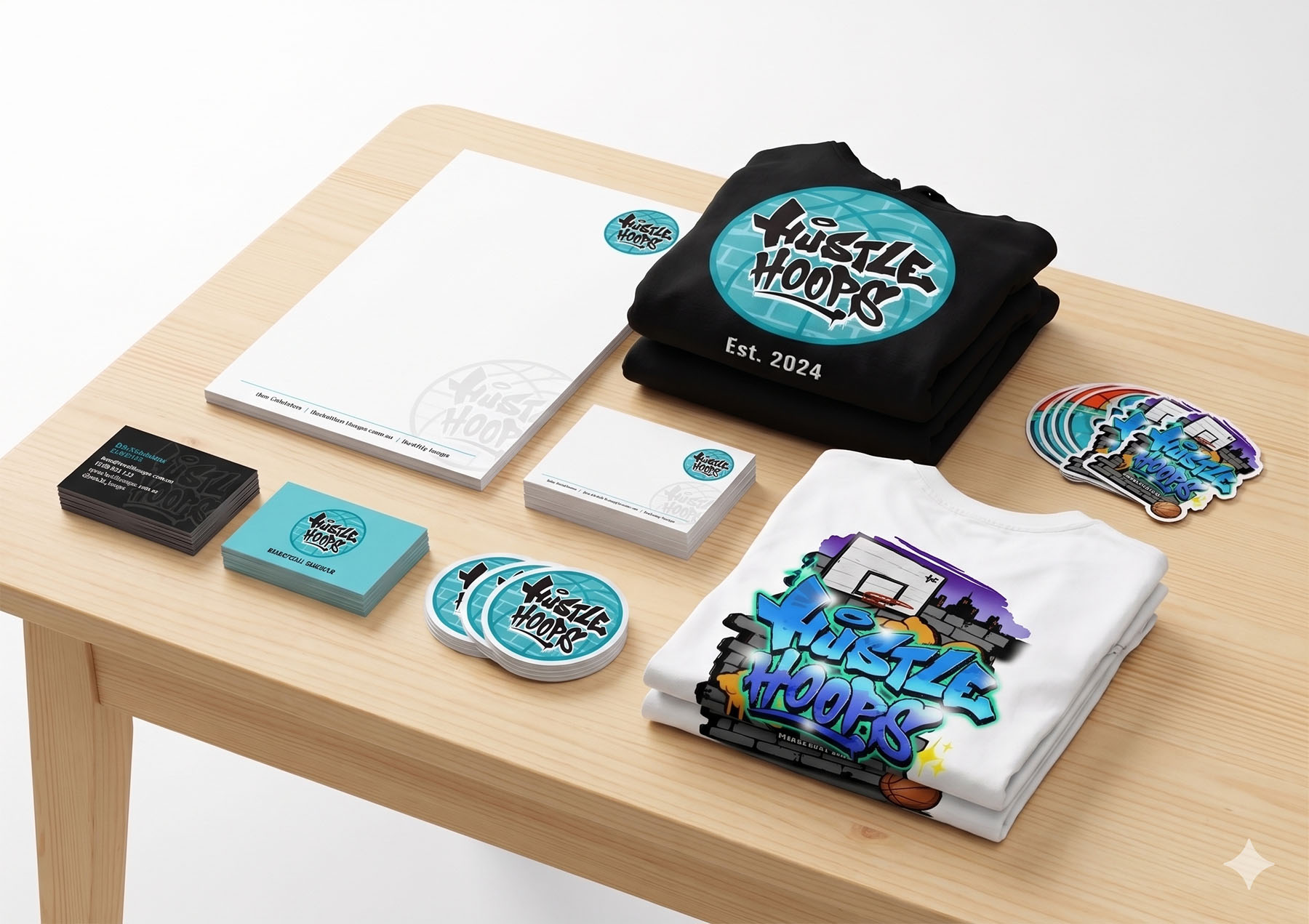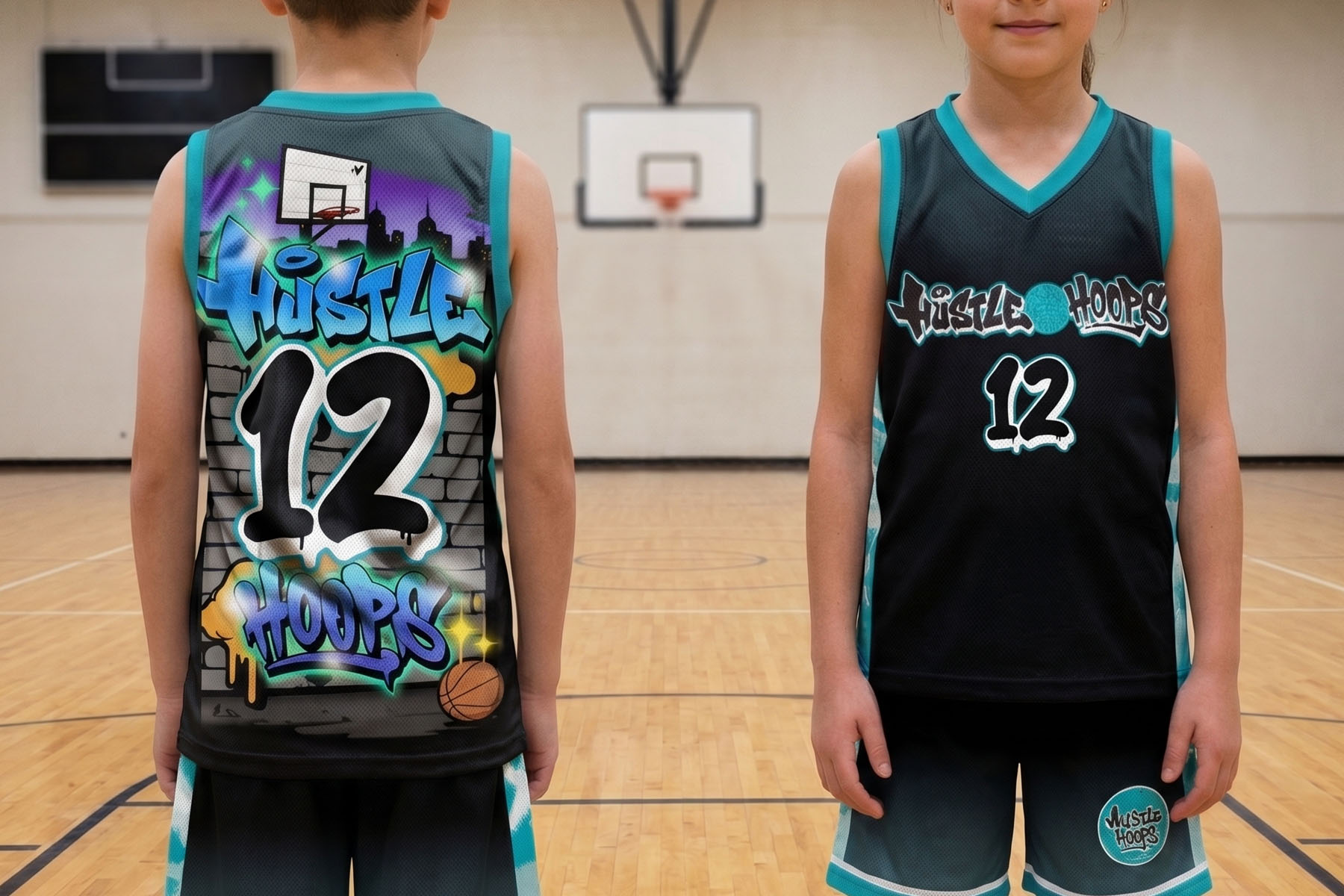 Thank you both again for your amazing work bringing our Hustle Hoops logos to life. The merchandise has been a huge success. The kids (and parents!) absolutely love the graffiti-style design on the training tops and we regularly see them being worn around!